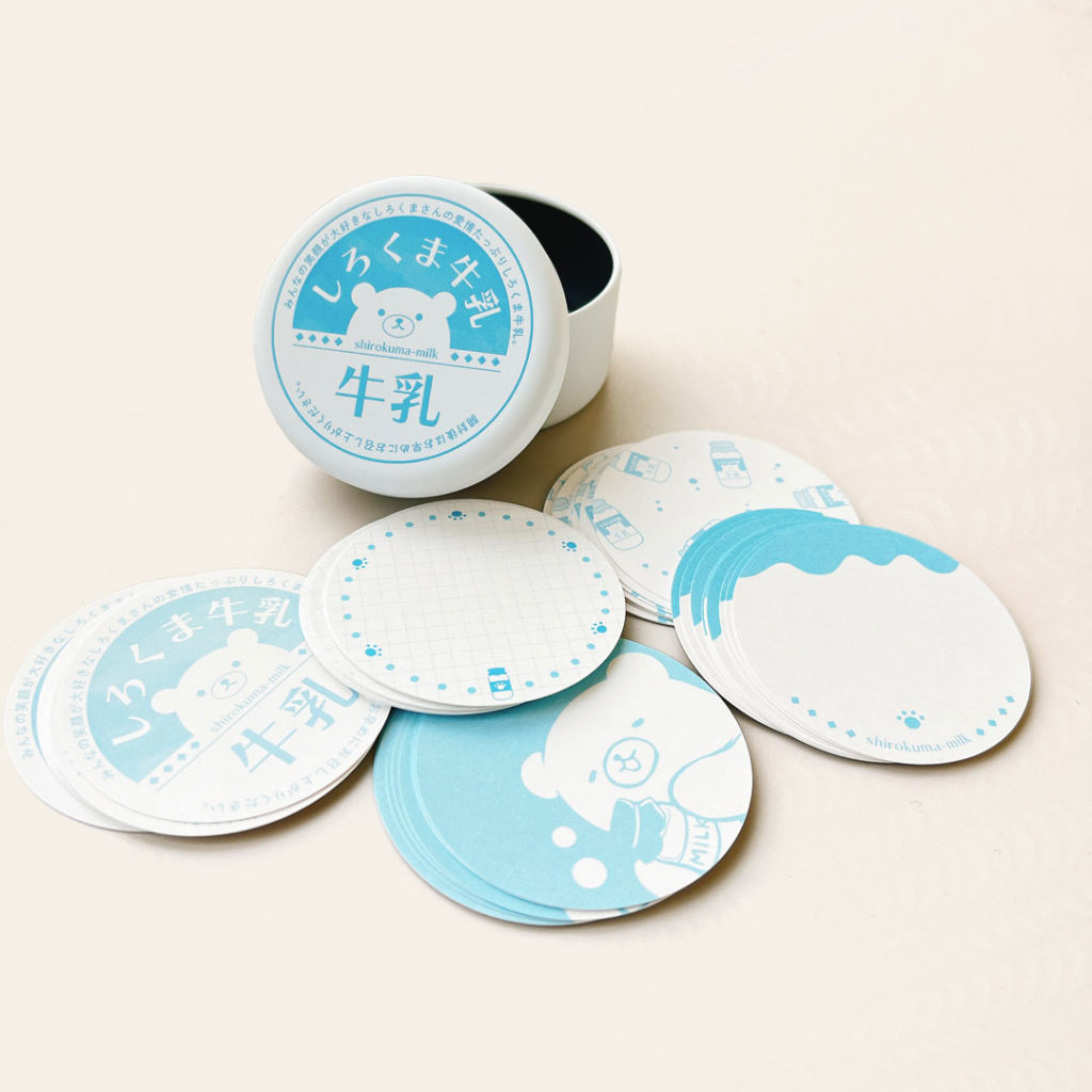 マットな質感と柔らかさを感じさせる形のまあるい缶に、しろくま牛乳シリーズの人気イラストをあしらった丸型メモが全5柄各10枚入り。