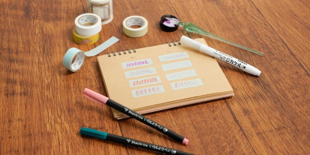 マスキングテープに塗布して乾燥させると、水性インキをはじかずに書くことができます。無色透明のインキなので、マスキングテープのデザインを損ねません。万年筆インキの濃淡やフラッシュもお楽しみいただけます。