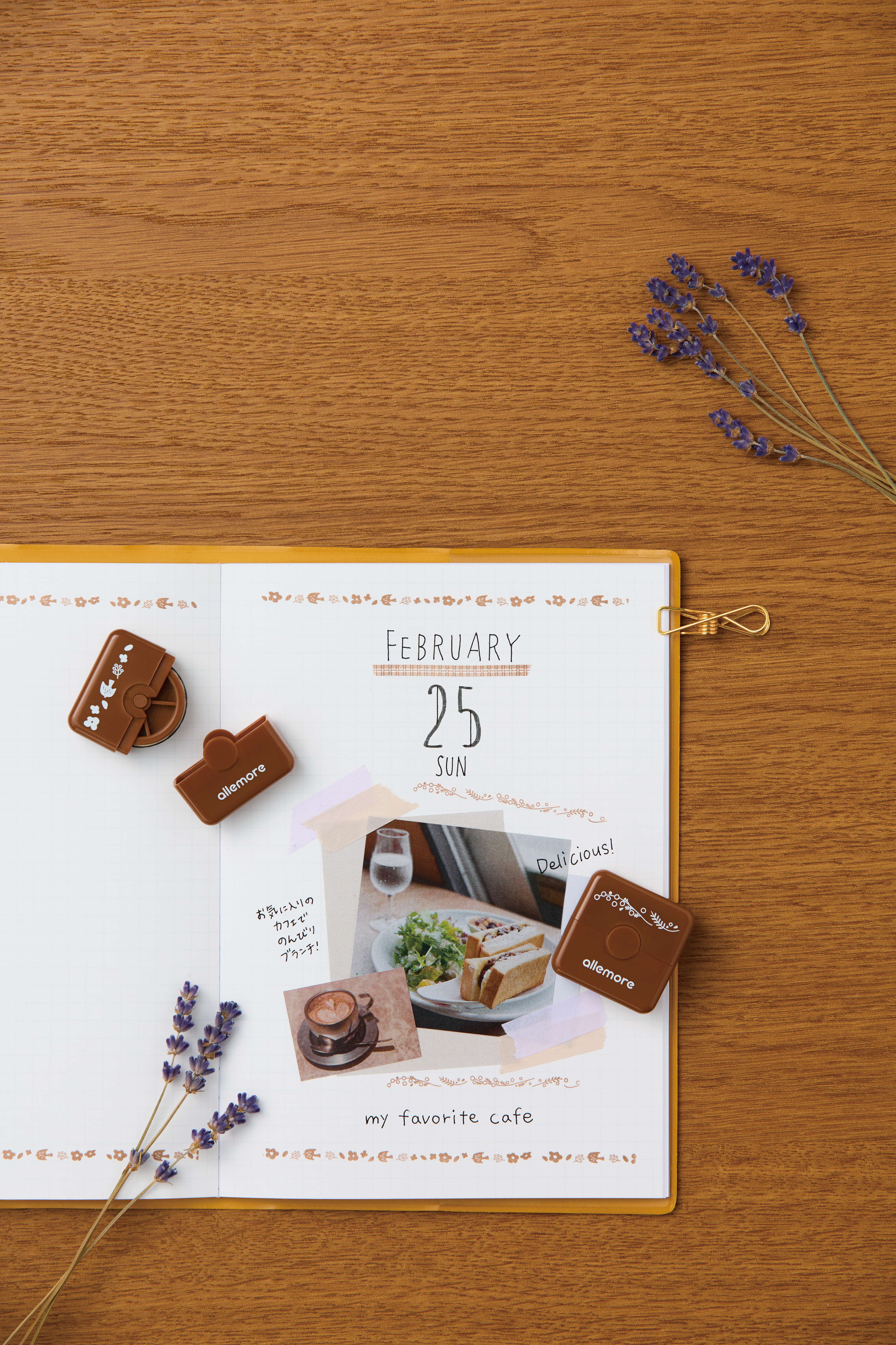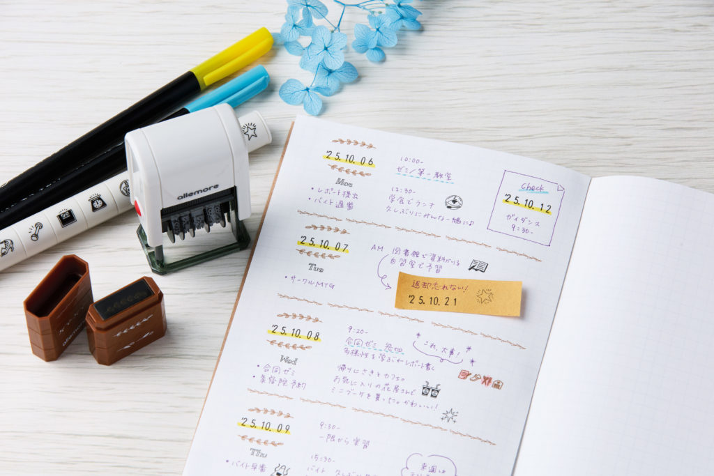 毎日の記録に便利な印面で、手帳・ノートがきれいに整う回転日付スタンプです。