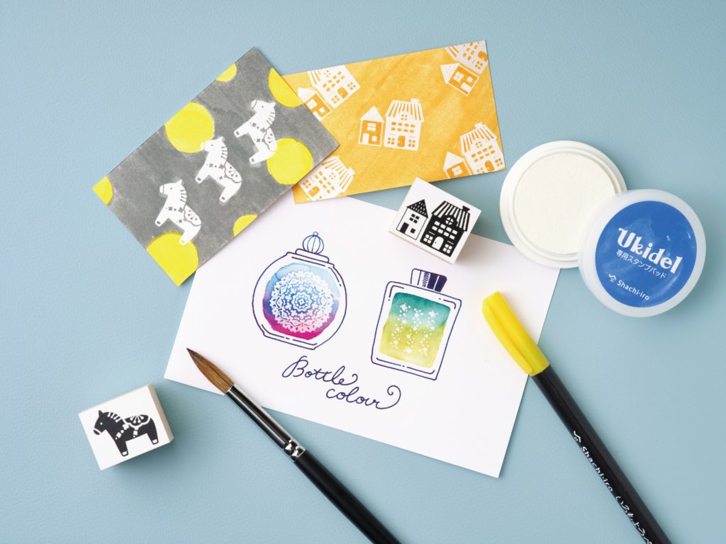 水性染料インキを弾く特殊インキを採用した白色のスタンプパッドです。お好きなゴム印でなつ印した印影の上から万年筆インクや水性ペンで塗ると、イラストが浮き出たように見えます。