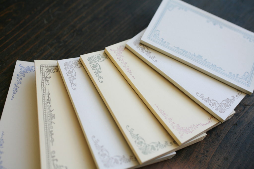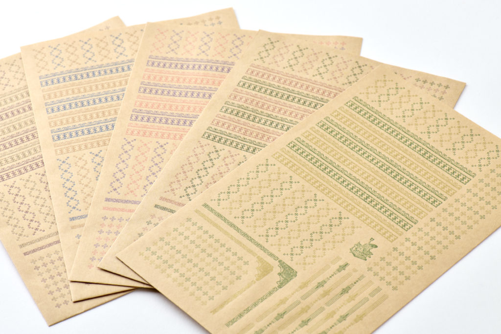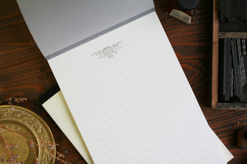 華やかなレトロ模様上部にリボンのようにあしらい、ドット入りの罫線で仕上げた縦書き用、華やかなレトロ模様をあしらい、罫線は極細でシンプルに仕上げたヨコ書き用があり、それぞれに純白の紙、淡クリーム色の紙の2種類から選べます。