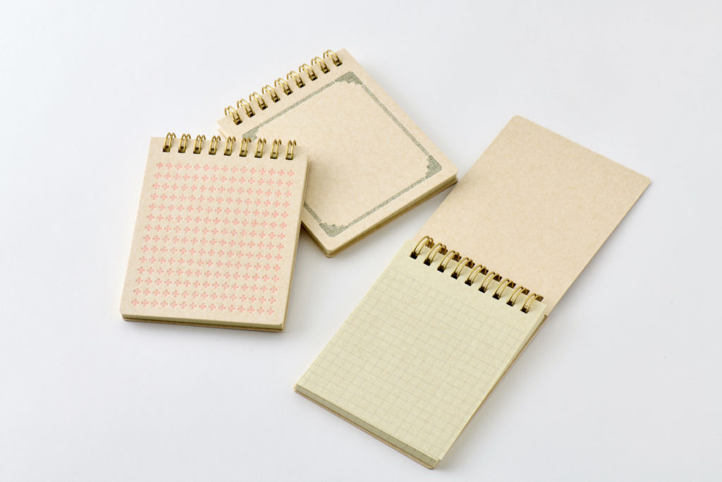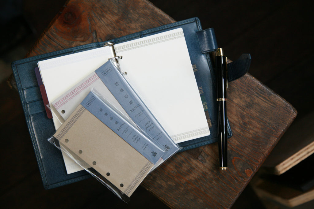 フールス紙使用・たっぷり書ける〈罫紙〉。レトロ表紙が選べるリングメモ〈雑記帳〉。英国製紙に印刷したM6・M5用タグ風インデックスや、レトロ柄を全面に施したサイドタブ型インデックス、万年筆での書き心地が選べるリフィルなど、システム手帳ユーザ向け紙ものも展開。