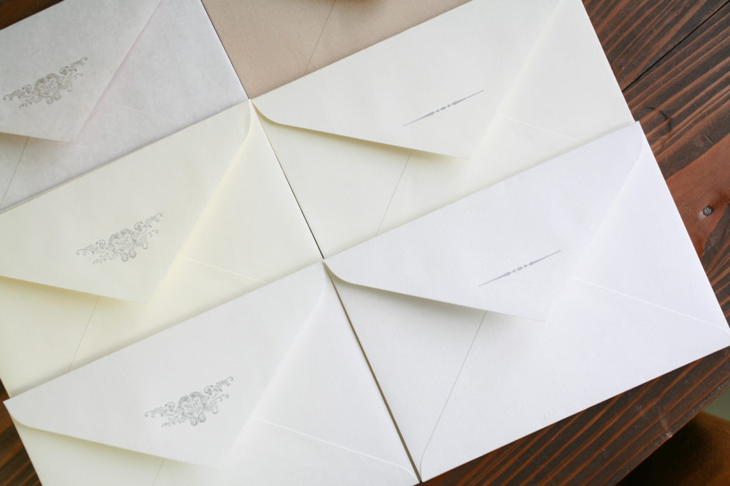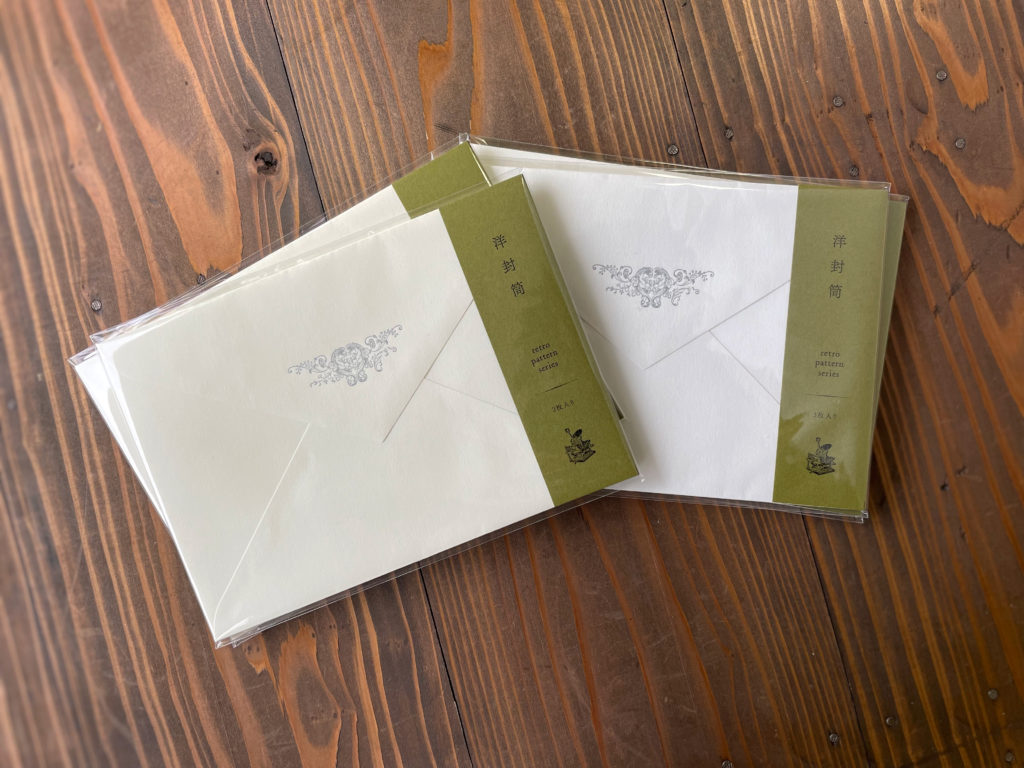 活版印刷で華やかなオルナメントをあしらった、シンプルレトロな洋封筒です。罫紙や便箋、A5サイズの紙が二つ折りで入るサイズで、横書きの「罫紙」と組み合わせてレターセットとして使えます。オーソドックスで、かしこまったお手紙や招待状にもちょっと映えそう。