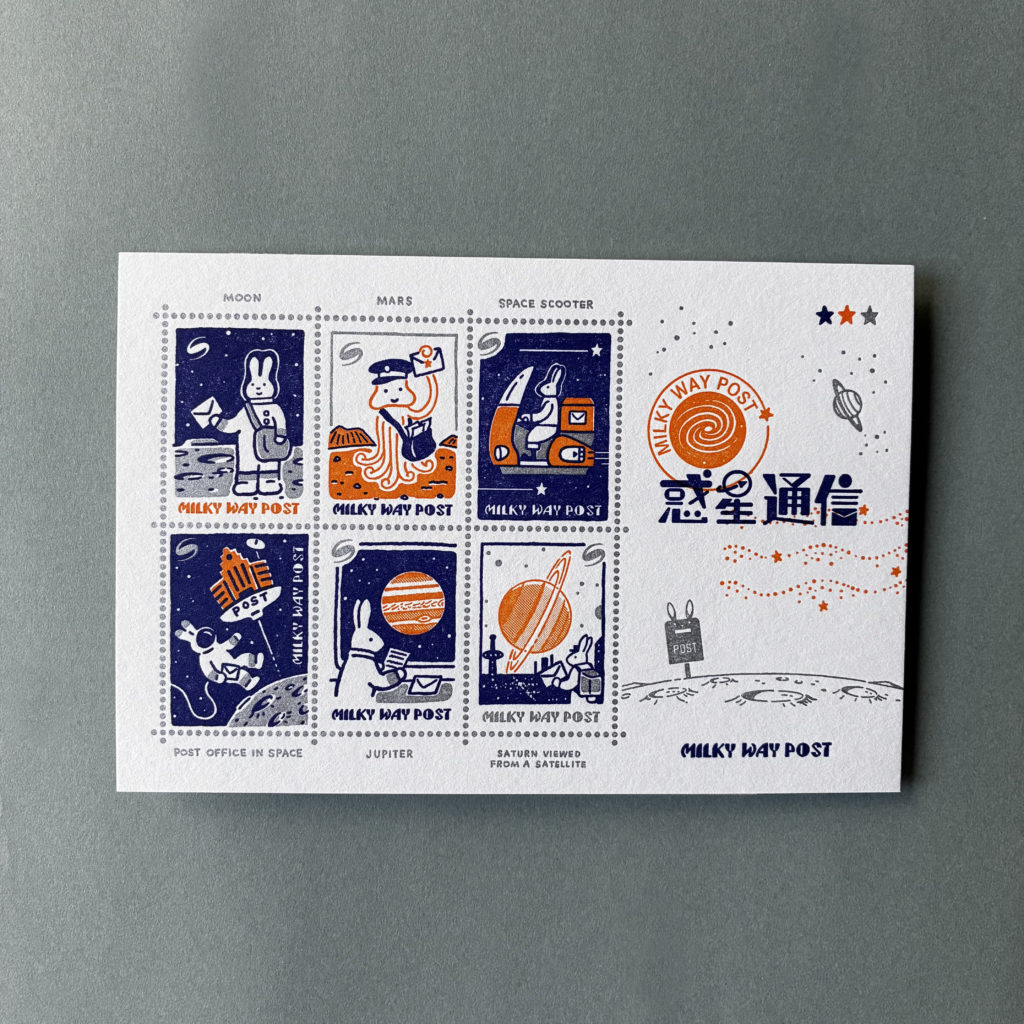 切手シート風の活版ポストカードです。切手の絵柄は「Milky Way Post切手シール」ほぼ同一ですが、使用している色や印刷技法が異なります。