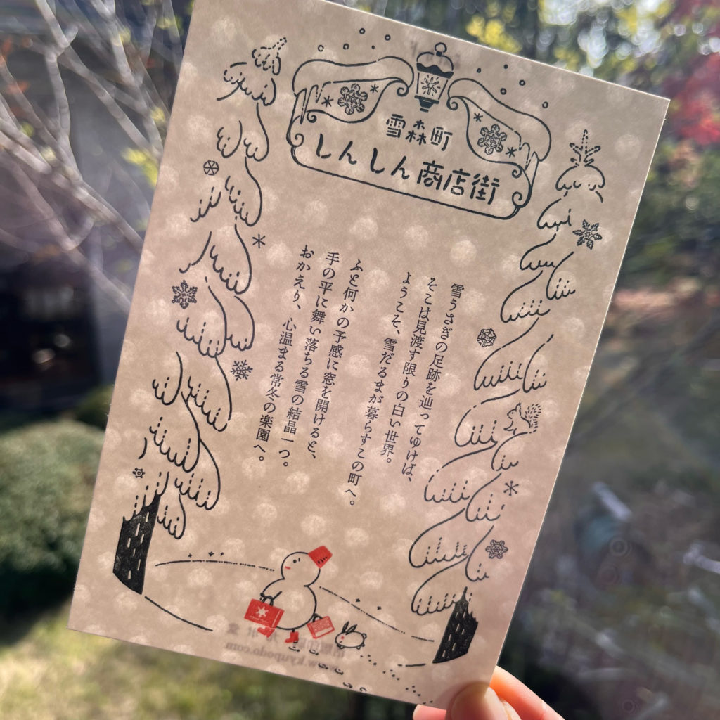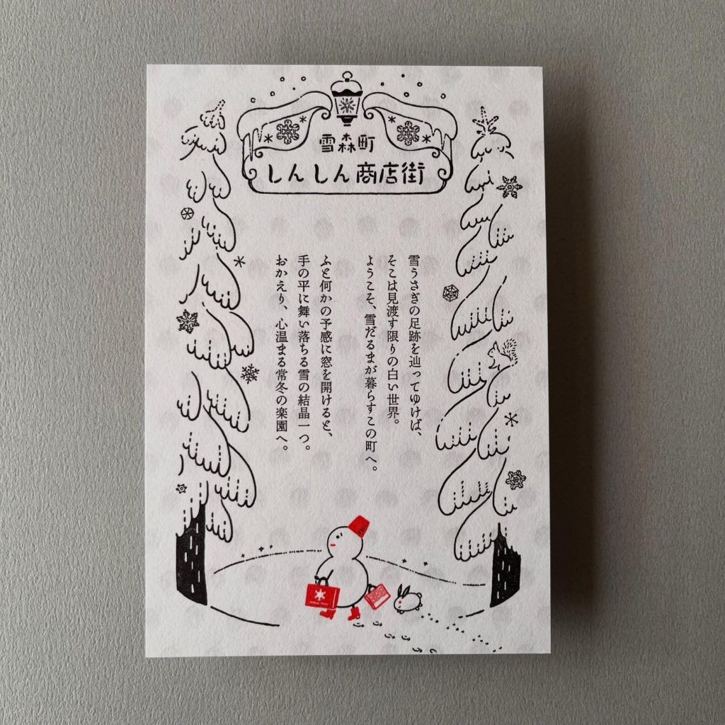 架空商店街ハガキシリーズに、新しい商店街が加わります。雪だるまが暮らす街の商店街です。水玉の模様の透かしがある「玉しき みずたま」という紙に印刷してみました。