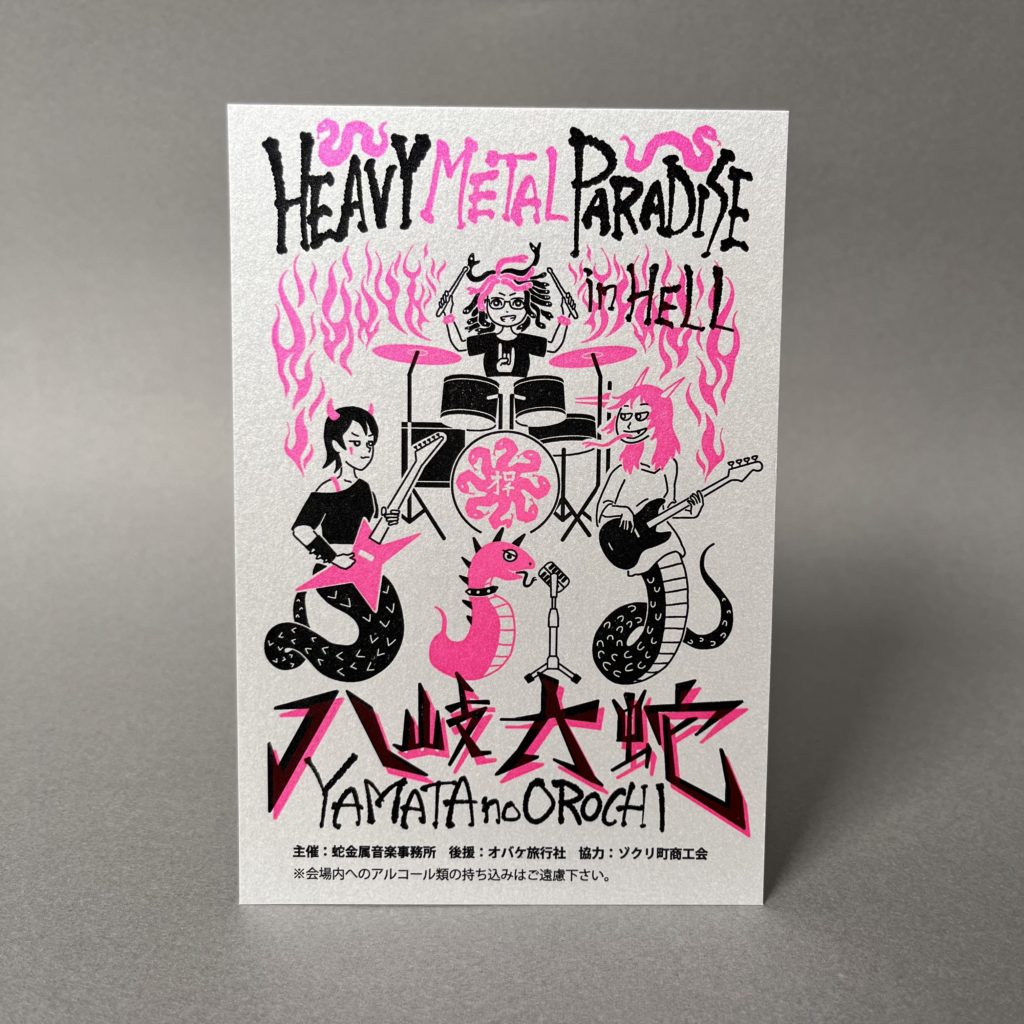 ツチノコ、メデューサ、濡女、ラミアのヘビメタバンド「八岐大蛇(ヤマタノオロチ)」。シルバーの紙に蛍光ピンクとスミで印刷しております。九ポ堂は2025年(ヘヴィー年)の年賀状として使用しました。
