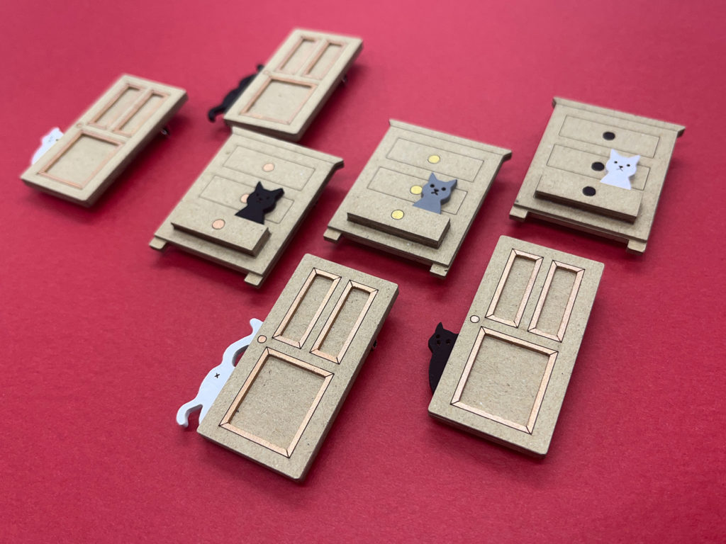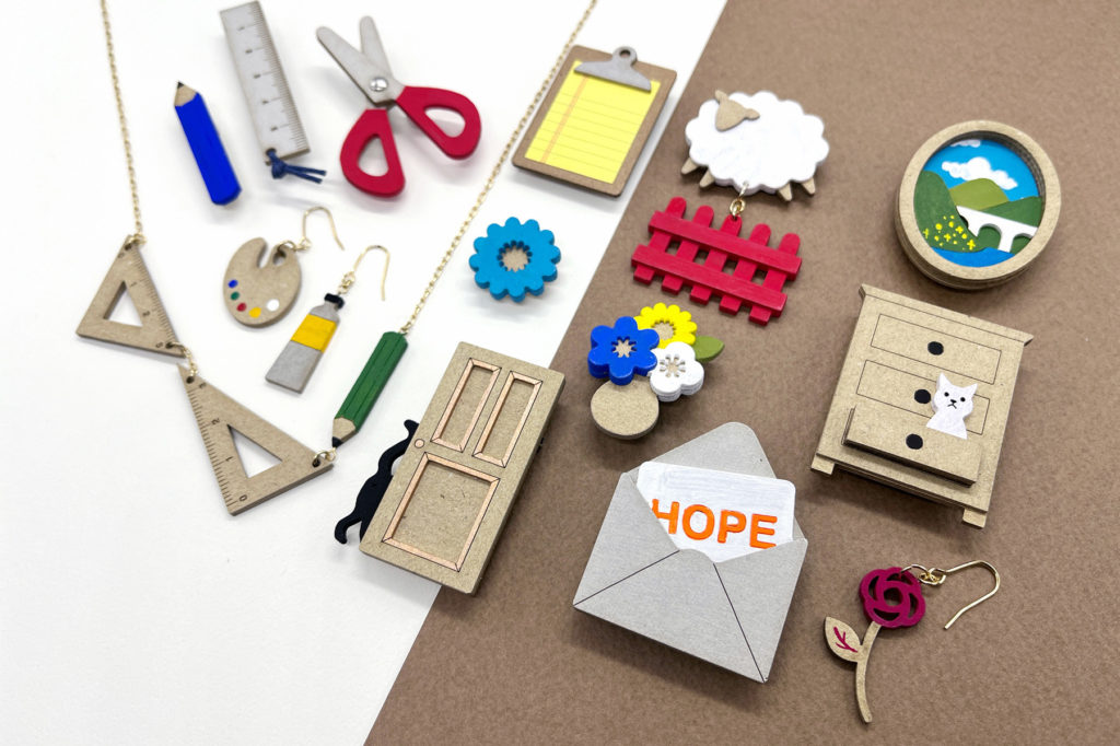 厚手のボール紙で作った、つけ心地の軽いブローチ・ピアス・イヤリング・ネックレスです。文具や窓枠など、少しユニークなモチーフを多く作っています。