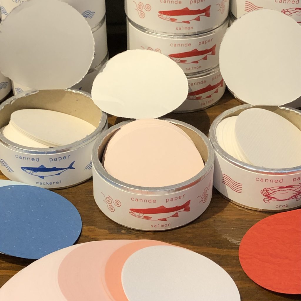 まるで本物の様な全部紙で出来た缶詰めです。缶のラベルのデザインに合わせたイメージの紙と丸く抜かれたメモ紙です。
