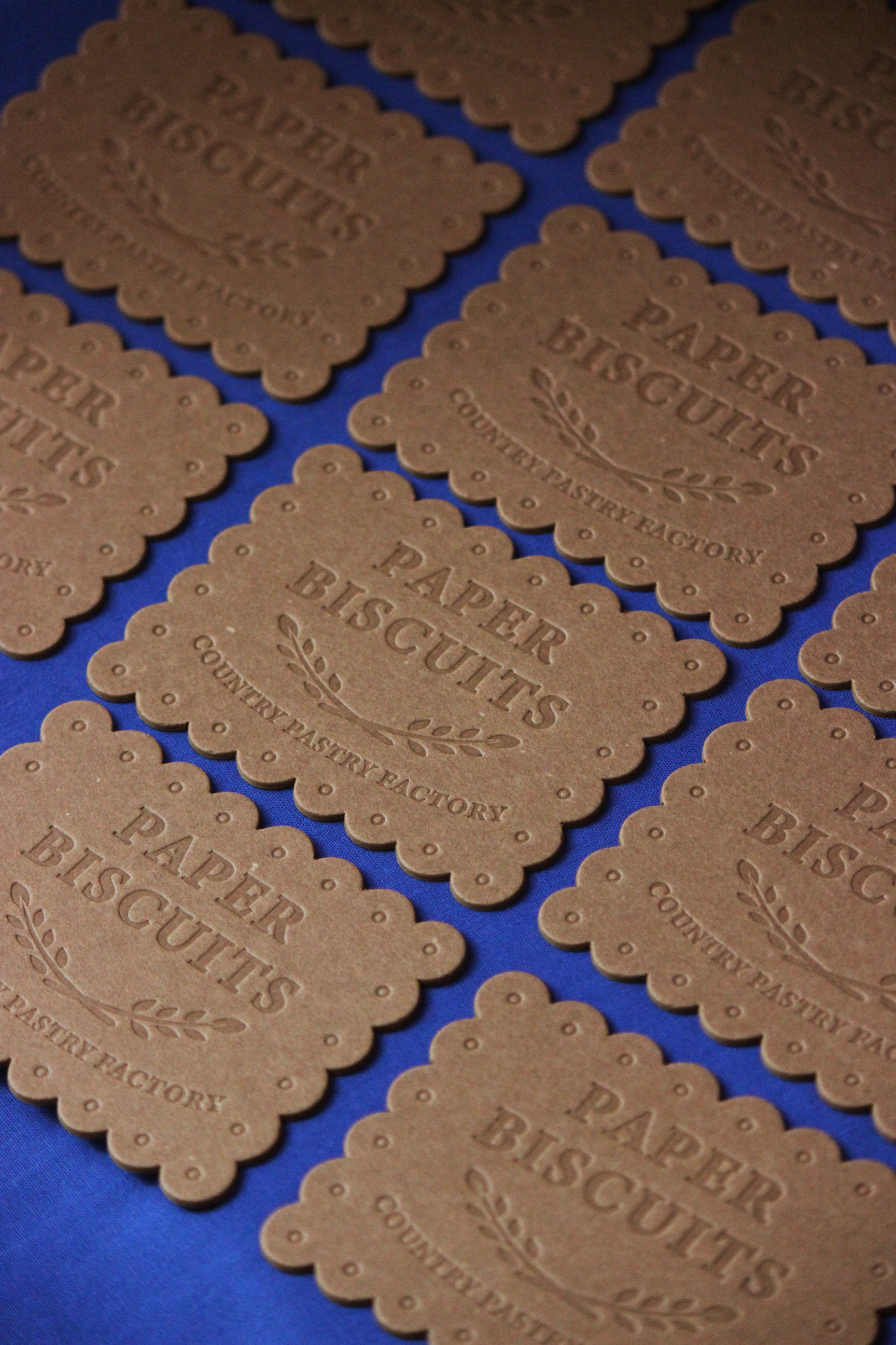 素朴なビスケットを再現した、紙のビスケットと封筒のセット。ビスケットのカードは、木材パルプと古紙で配合したファンシーペーパー。型押しでビスケット生地に模様をつけたように。封筒はペーパービスケットを入れる水色のペンシルストライプがアクセントです。